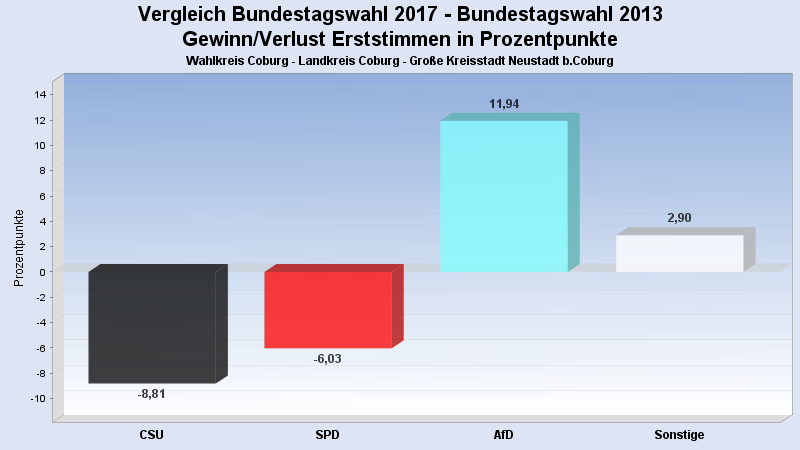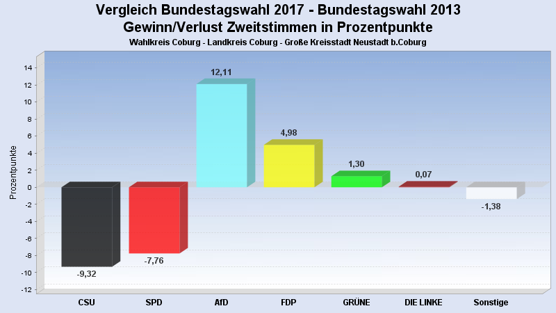 | Partei | Zweitstimmen 2017 | Prozent 2017 | Zweitstimmen 2013 | Prozent 2013 | |